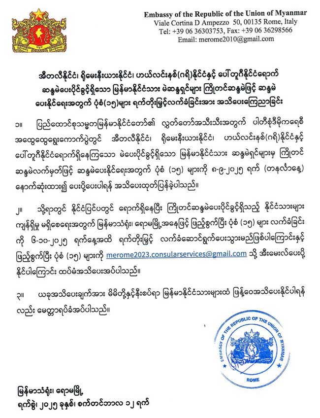 အီတလီနိုင်ငံ၊ ရိုမေးနီးယားနိုင်ငံ၊ ဟယ်လင်းနစ်(ဂရိ)နိုင်ငံနှင့် ပေါ်တူဂီနိုင်ငံရောက် ဆန္ဒမဲပေးပိုင်ခွင့်ရှိသော မြန်မာနိုင်ငံသား မဲဆန္ဒရှင်များ ကြိုတင်ဆန္ဒမဲဖြင့် ဆန္ဒမဲပေးနိုင်ရေးအတွက် ပုံစံ(၁၅)များ ရက်တိုးမြှင့်လက်ခံခြင်းအား အသိပေးကြေညာခြင်း